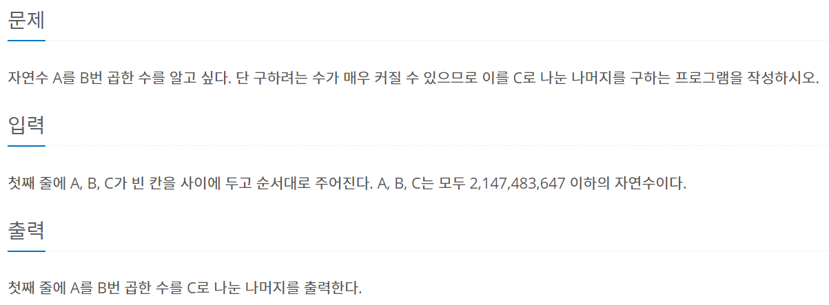 문제를 보면 A를 B승하고 C로 나눈 나머지를 구하라는 뜻이다.