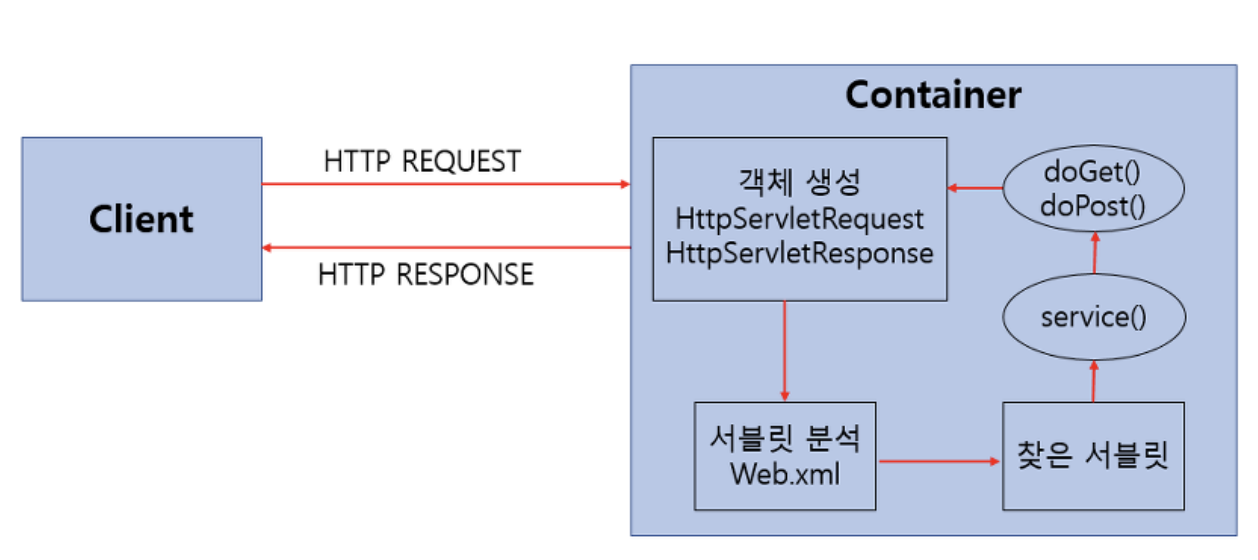 - 사용자가 URL을 입력하면 HTTP Request가 Servlet Container로 전송한다.