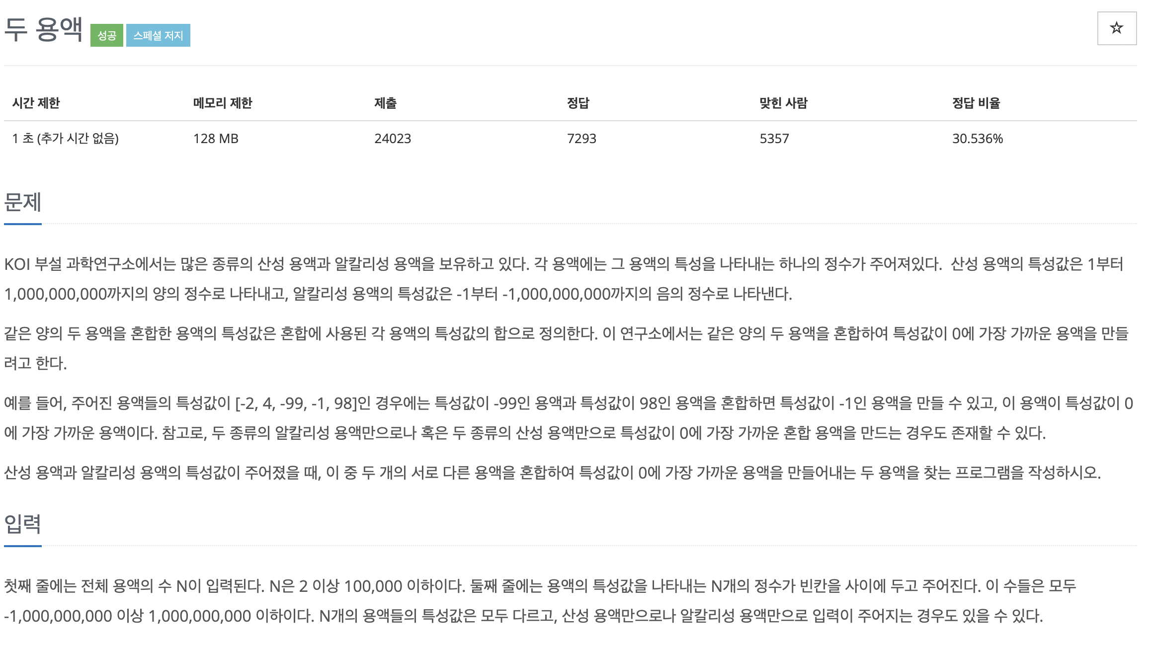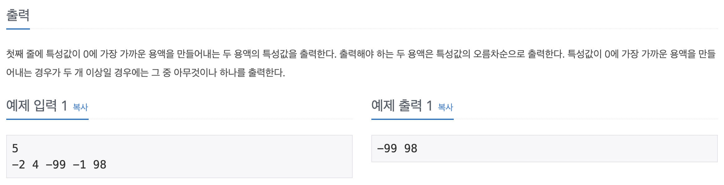 입력으로 주어지는 N값은 100,000이다. 만약 모든 용액을 서로 비교한다고 가정한다면 100,000 * 100,000 경우의 수를 연산해야한다. 이러한 경우 연산 횟수가 너무 많아지기 때문에 완전 탐색으로 풀수가 없다.