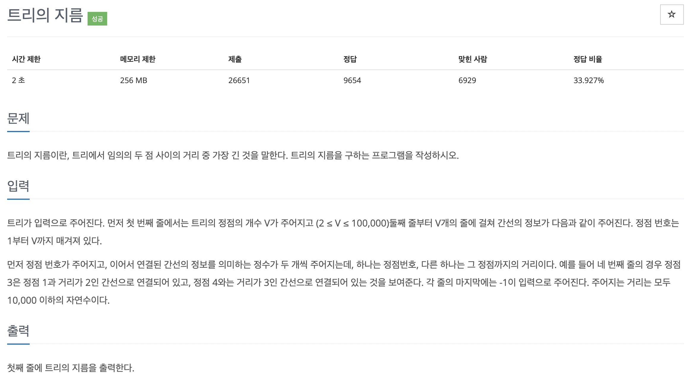 트리가 주어진다. 이때 트리의 지름을 구하는 문제이다. 트리의 지름을 어떻게 구해야하는지 이해하지 못하면 풀수가 없다.