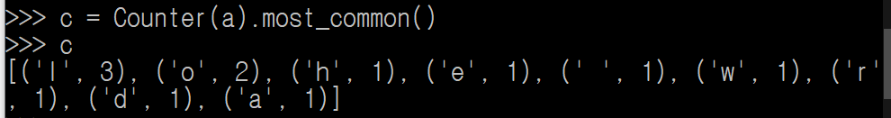 Counter에서 중요한 함수는 most_common이다. 이 함수를 사용하면 가장 많이 사용된 데이터를 기준으로 정렬을 하게된다. 기존에 객체만 선언하게 되면 Counter객체에 속해 있기 때문에 숫자 인덱스로 접근이 불가능하다. 따라서 most_common을 사용해서 리스트로 값을 받아내면 편하게 사용가능하다.