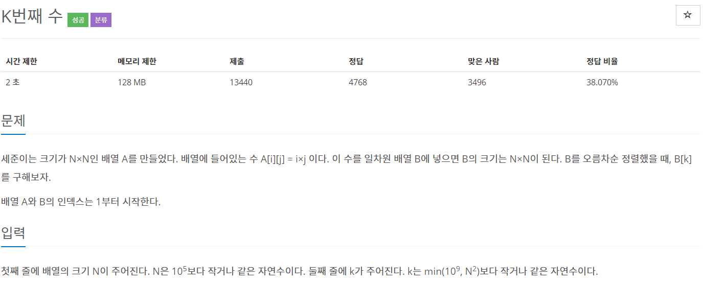 | 1 | 5 | 9 | m이 5라면 몇번째 정도일지 예상해보는것이다. 행렬을 1행부터 3행까지 몇개의 값이 5보다 작은지 확인하면 3+2+1 = 6개가 된다. 그럼 k값보다 작기 때문에 l값을 m+1로 바꿔준다. |