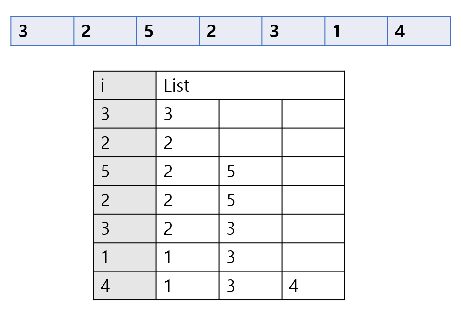 i가 4일때 리스트의 마지막 값인 3보다 크다. 따라서 4를 삽입한다. 그럼 결과적으로 최장 부분 수열의 길이는 3이 된다.
