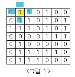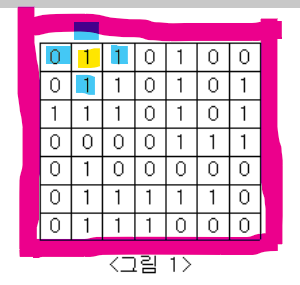 그럼 2번 DFS로 행렬들의 인접을 어떻게 파악할건지 생각해본다. 현재 (0,1)에서 가장 먼저 집이 발견된다. 문제는 동서남북 모두 확인하여 인접한 행렬을 확인해야 하는데 위에는 접근할 수가 없다.